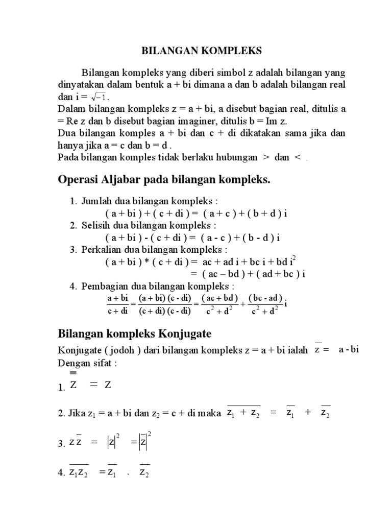 Submateri tersebut merupakan pengantar dari analisis kompleks. Jika pada suatu bilangan kompleks nilai b adalah 0 maka bilangan kompleks tersebut menjadi sama dengan bilangan real a. Jika a dan b bilangan real maka berlaku a b atau a b atau a b.