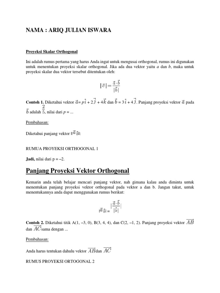 Contoh soal dan jawaban proyeksi vektor ortogonal. Terdapat dua proyeksi ortogonal yang akan di bahas pada pembahasan kali ini yaitu proyeksi skalar dan vektor ortogonal. Rangkuman materi bab vektor disertai contoh soal dan jawaban dengan pembahasan lengkapnya simak disini page 4. Diketahui vektor a 2 3 4 dan b x 0 3.