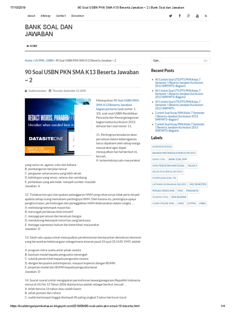 Soal Soal Dan Jawaban Usbn Pkn Tingkat Sma Smk Tahun 2019