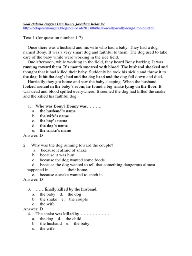 Soal Bahasa Inggris Smp Kelas 7 Dan Kunci Jawabannya ...